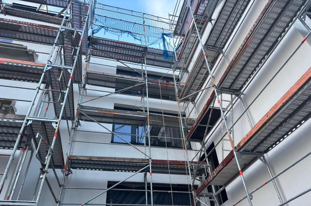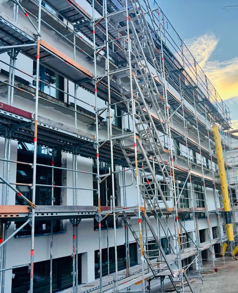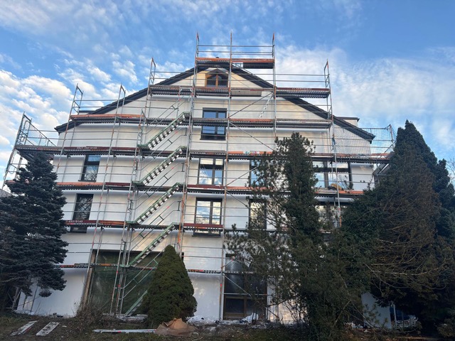 Der Aufbau des Gerüstes ist abgeschlossen. In Kürze wird mit der Sanierung des Daches inklusive Dämmung begonnen.